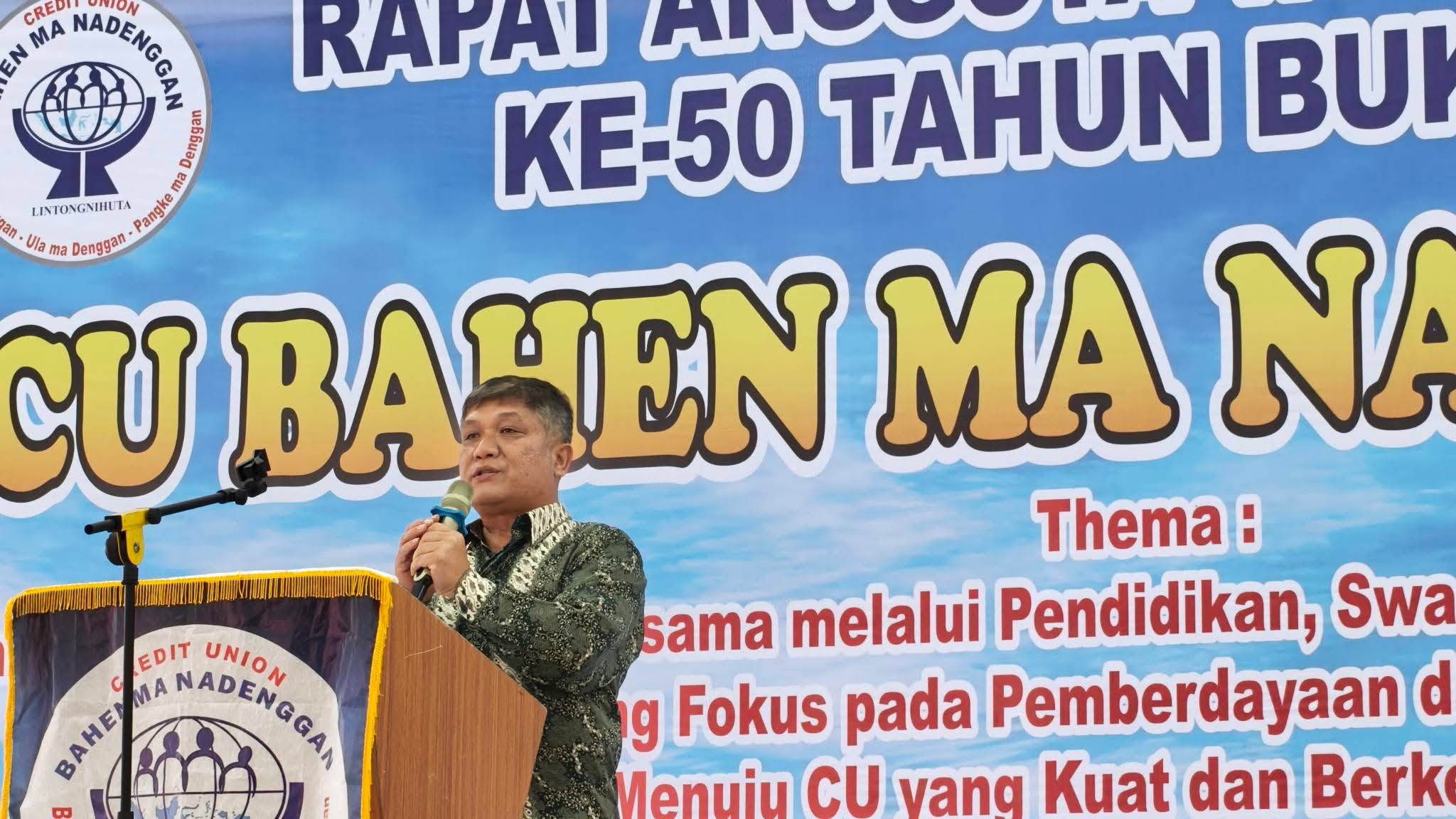 Junior Lumbantoruan memaparkan capaian pertumbuhan positif CU Bahen Ma Nadenggan sepanjang tahun buku 2025.