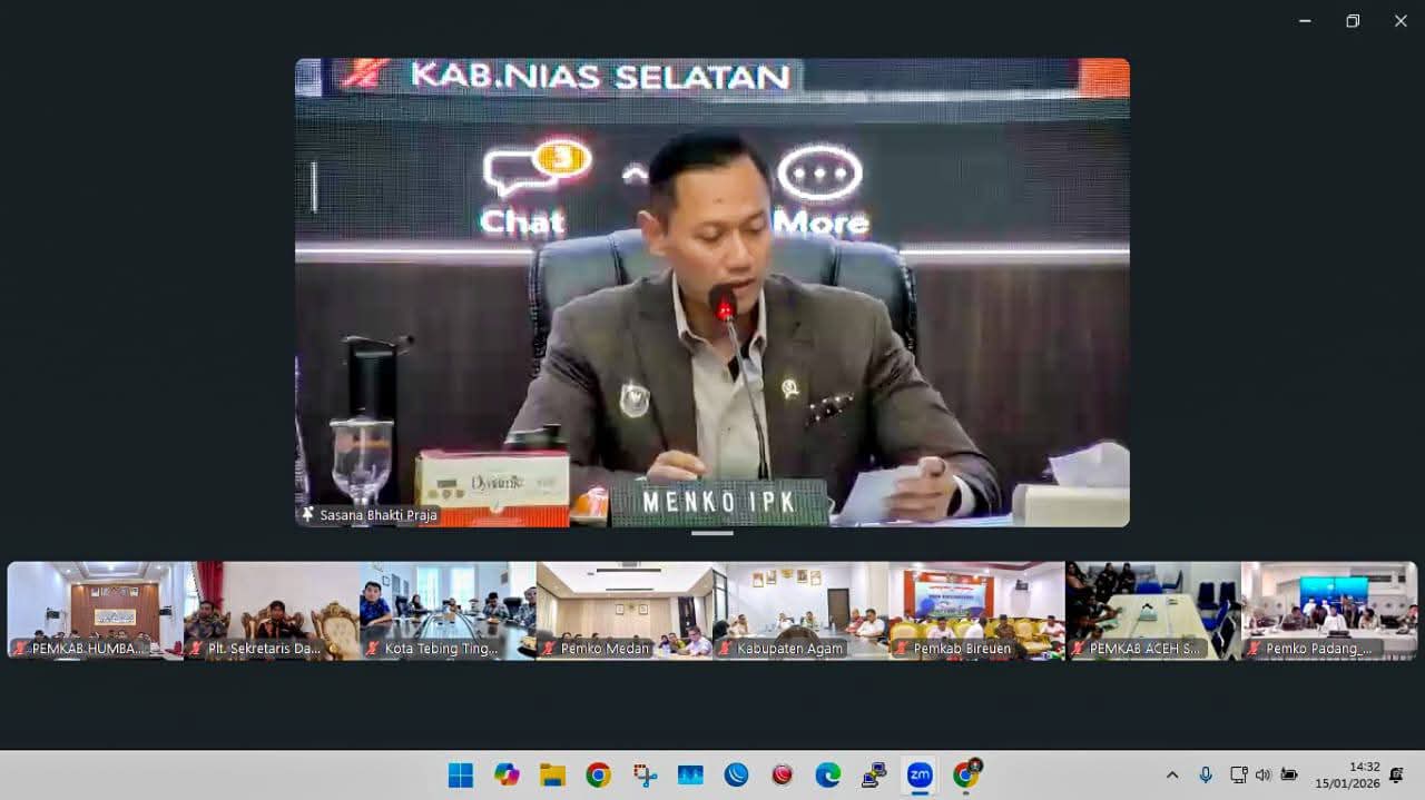 Bupati Humbang Hasundutan Dr. Oloan Paniaran Nababan, SH, MH diwakili Asisten Pemerintahan dan Kesra Sabar Purba mengikuti Rapat Koordinasi (Rakor) Pengecekan Indikator Pemulihan Pemerintahan dan Kemasyarakatan Pasca Bencana di Wilayah Sumatera yang dipimpin langsung oleh Menteri Menteri Koordinator Bidang Pembangunan Manusia dan Kebudayaan, Pratikno, Kamis 15 Januari 2026.