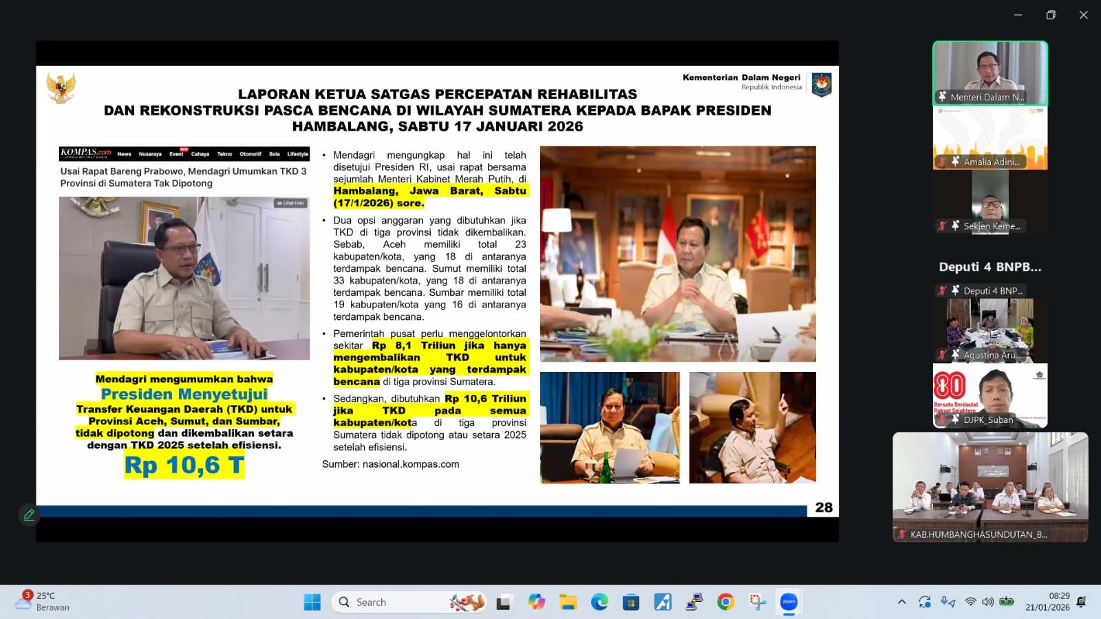 Pada kesempatan itu, Mendagri Tito Karnavian menyampaikan bahwa Presiden RI, Bapak Prabowo menginstruksikan untuk penanganan paska bencana banjir dan longsor segera dan presiden juga sudah menyetujui agar Dana Transfer Ke Daerah (TKD) Tahun Anggaran 2026 dikembalikan setara dengan TKD 2025 setelah efisiensi.
